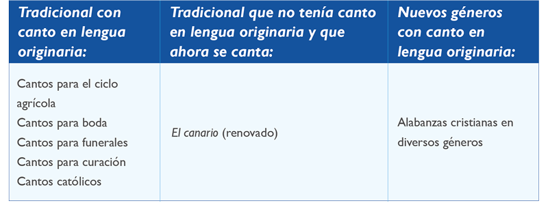 Con nuevos géneros en los que se han incluido cantos en lengua originaria nos referimos a los himnos y alabanzas que se han creado, usando diversos géneros populares y tradicionales, y que se cantan en lengua originaria, en diversas religiones cristianas (García, 2016, pp. 223-243).