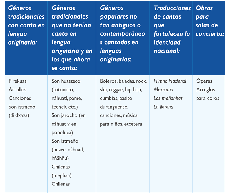 La música tradicional de los pueblos originarios de México tiene manifestaciones tanto en español como en lenguas originarias; por ejemplo, los cantos ceremoniales y de siembra o los cantos chamánicos de curación, así como otros géneros como los sones, las pirekuas, el huapango, etc. Actualmente, la música en lenguas indígenas ha traspasado las fronteras de la tradición para abordar también diversos géneros contemporáneos, desde ritmos populares como música tropical, pop, rock, rap, hip hop y ska hasta propuestas para salas de conciertos. Lo anterior es interesante porque la lengua cantada se manifiesta en las relaciones sociales y acarrea una diversidad de expresiones que conforman la identidad de un pueblo a través del tiempo.